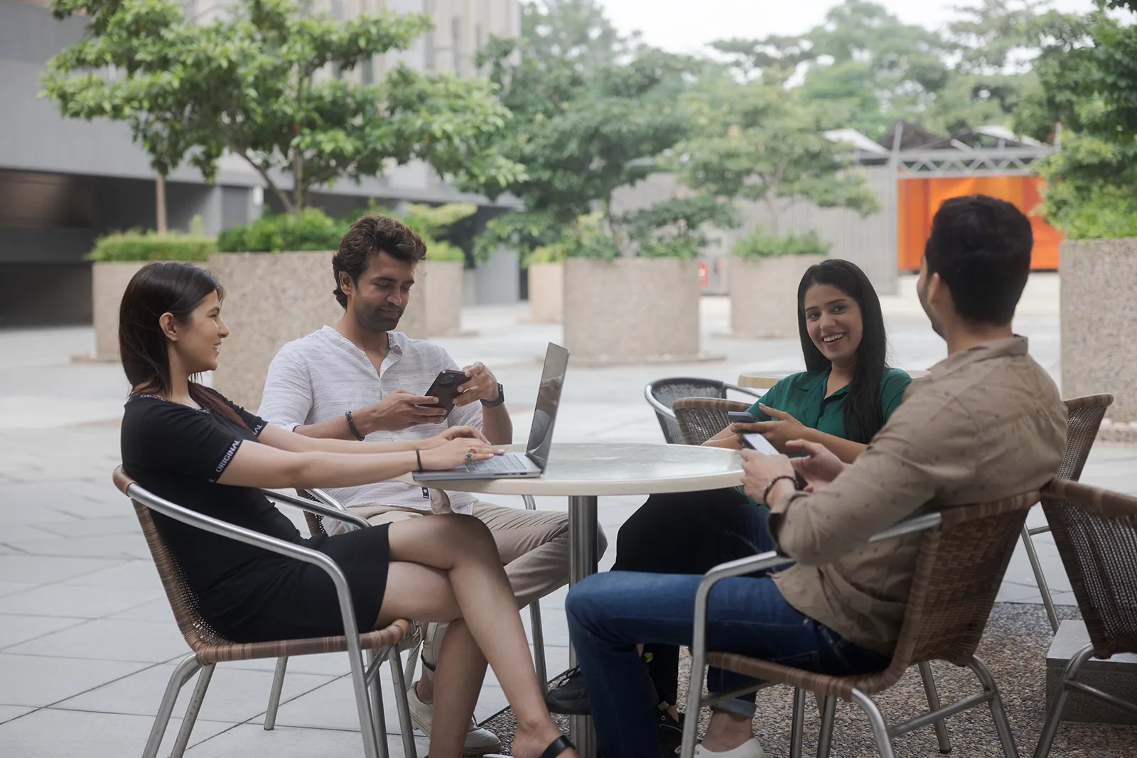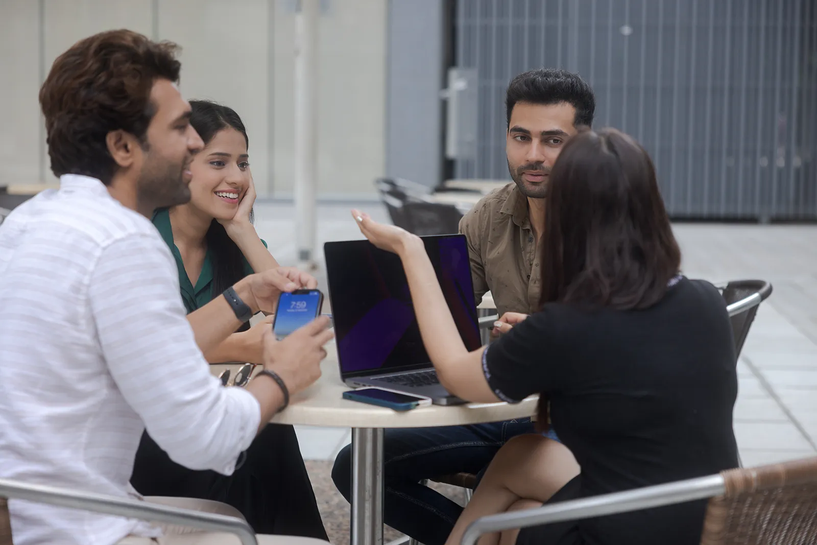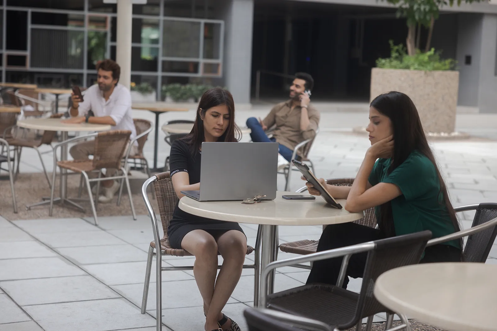 We shot across outdoor urban settings — open plazas, cafe terraces, and walkways — using natural light throughout. Solo shots captured focused, productive moments; group shots showed easy collaboration and conversation. The wide outdoor backgrounds gave the campaign a modern, aspirational feel without looking corporate.
