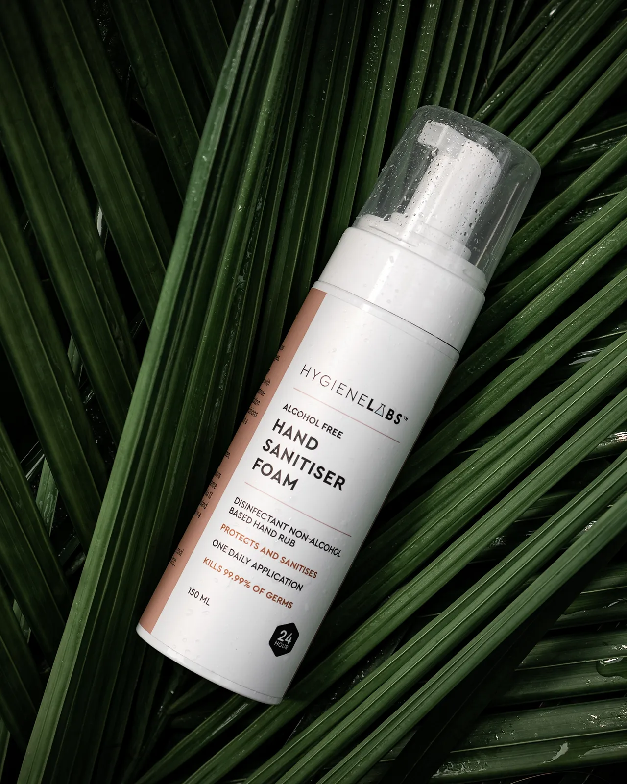 Hygiene Labs came back for a second shoot as the brand grew. This time they needed two distinct looks: dark, moody nature-backdrop shots of the products on tropical leaves for campaign hero images, and bright, colourful pastel studio setups — pink, lavender, and yellow — for social media posts and catalog listings.