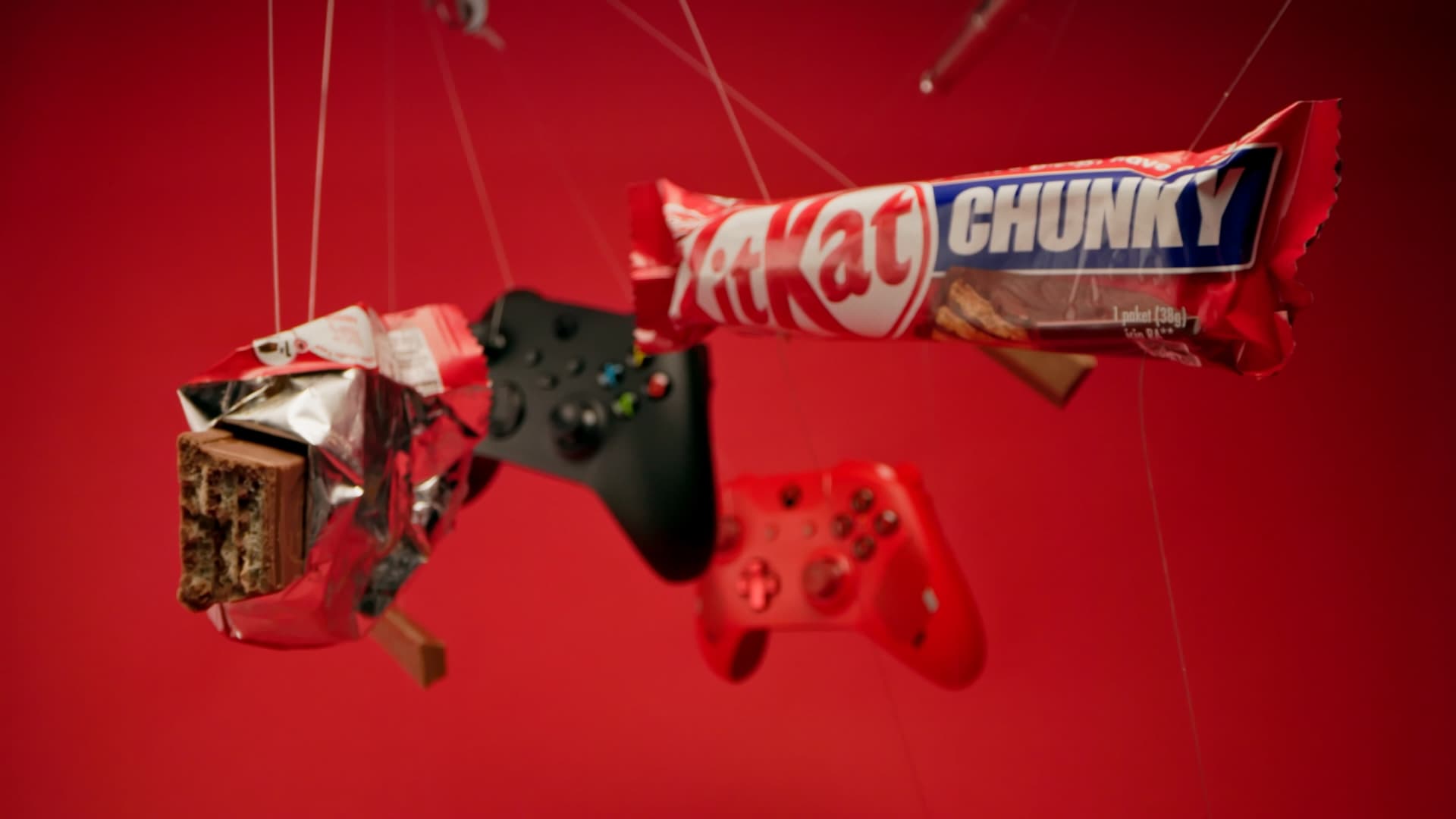 Every KitKat bar and gaming controller was rigged with fishing lines and suspended in frame to create the illusion of zero-gravity product shots. A probe lens let us push deep into the product for macro detail shots that feel cinematic. The real craft was in the edit: every visible line was frame-by-frame removed in post, leaving only the floating product.
