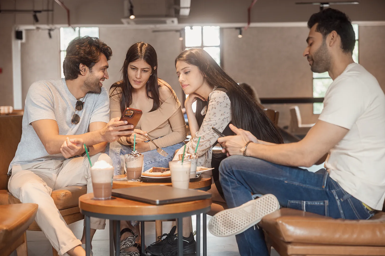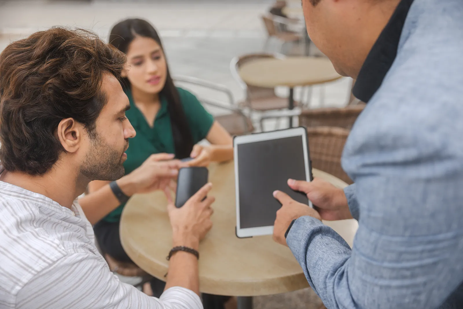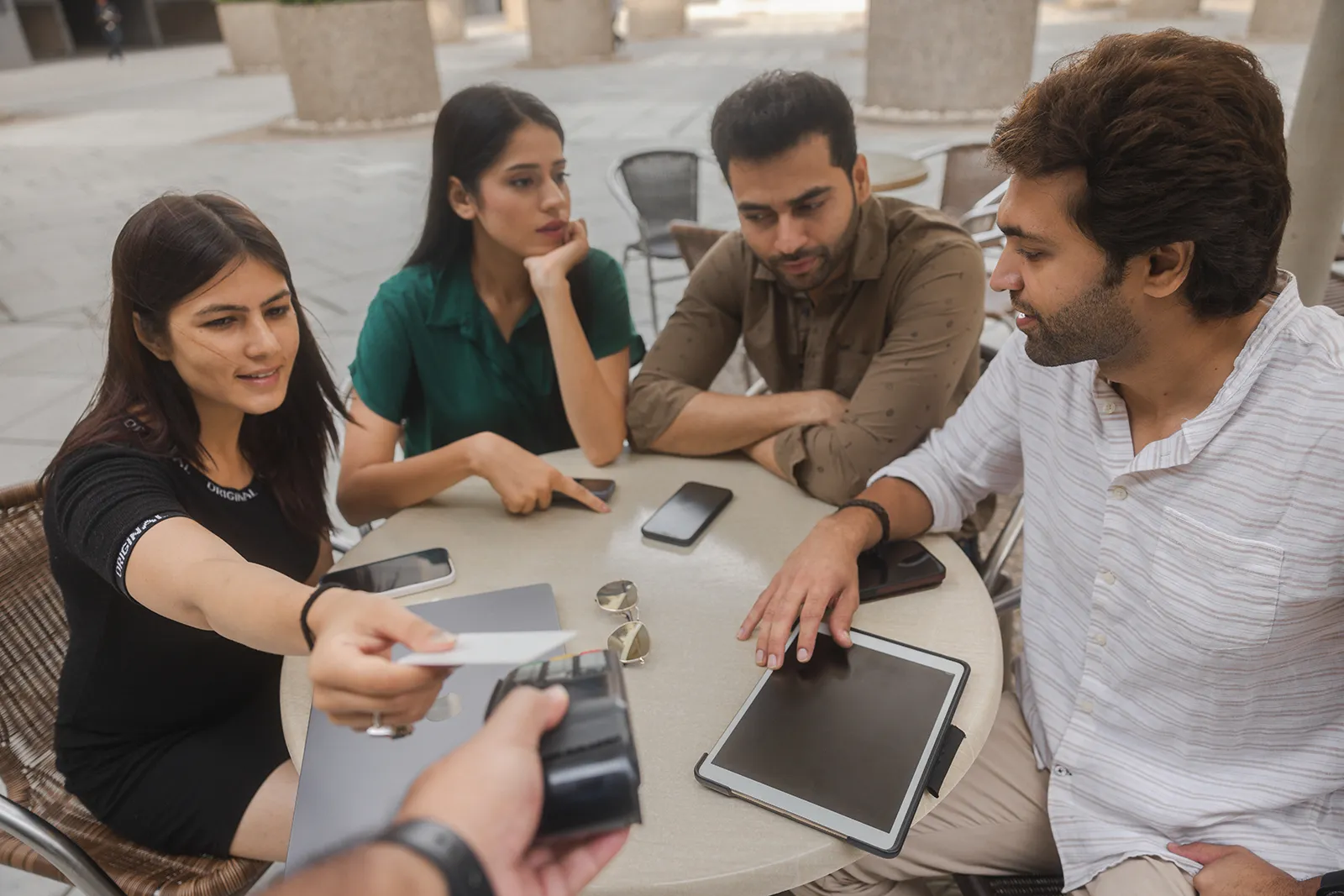 We shot across outdoor cafe terraces and indoor coffee shop settings to get both the ambient outdoor light and the warm interior tones. Scenes were built around real interactions — someone handing over a phone to pay, a group ordering from a tablet, a solo shot checking a receipt. Nothing was over-staged; the tech had to feel like a natural part of the moment.